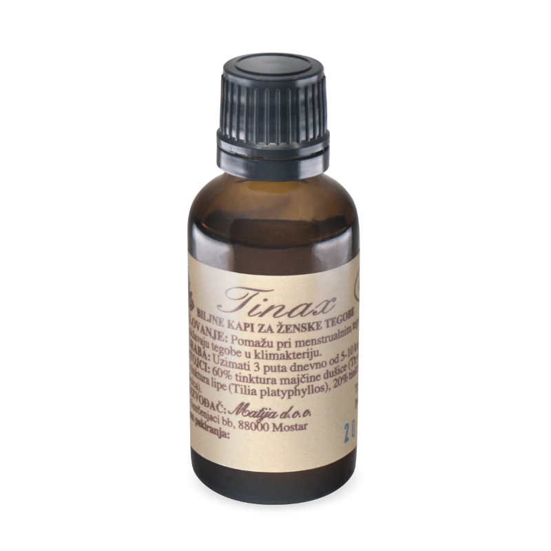 Biljne kapi za ženske tegobe- TINAX pomažu kod mnogih neugodnosti i problema vezanih za ženski reproduktivni sustav. Upale jajnika i maternice, grčeviti i bolni periodi, znojenje i razdražljivost žena u klimaksu su samo mali dio problema koje ove kapi ublažavaju i čak u potpunosti rješavaju. Potiču rast i razvoj ženskih spolnih organa i spriječavaju pojavu bijelog pranja. Reguliraju neredovan menstrualni ciklus i pokreću funkciju jajnika i maternice